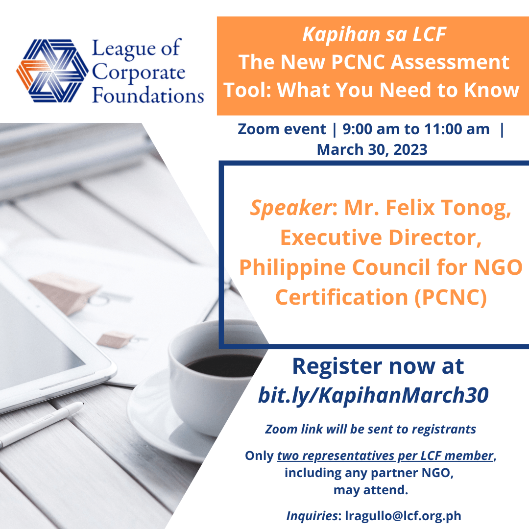 This upcoming Kapihan sa LCF session features Felix Tonog, Executive Director of the Philippine Council for NGO Certification (PCNC).