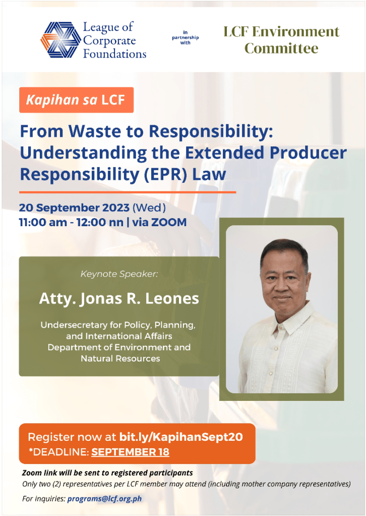 On September 20, 2023, in partnership with the LCF Environment Committee, LCF organized an online Kapihan sa LCF session entitled “From Waste to Responsibility: Understanding the Extended Producer Responsibility (EPR) Law”.