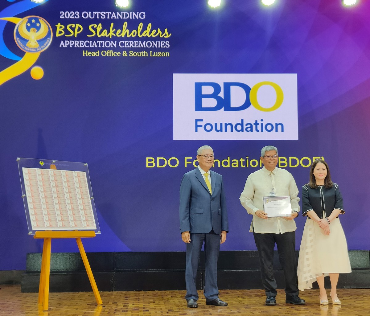 For its efforts to collaborate with the government and contribute to nation-building through the implementation of financial inclusion initiatives, BDO Foundation received recognition from the Bangko Sentral ng Pilipinas (BSP) at the 2023 Outstanding BSP Stakeholders Appreciation Ceremonies.
