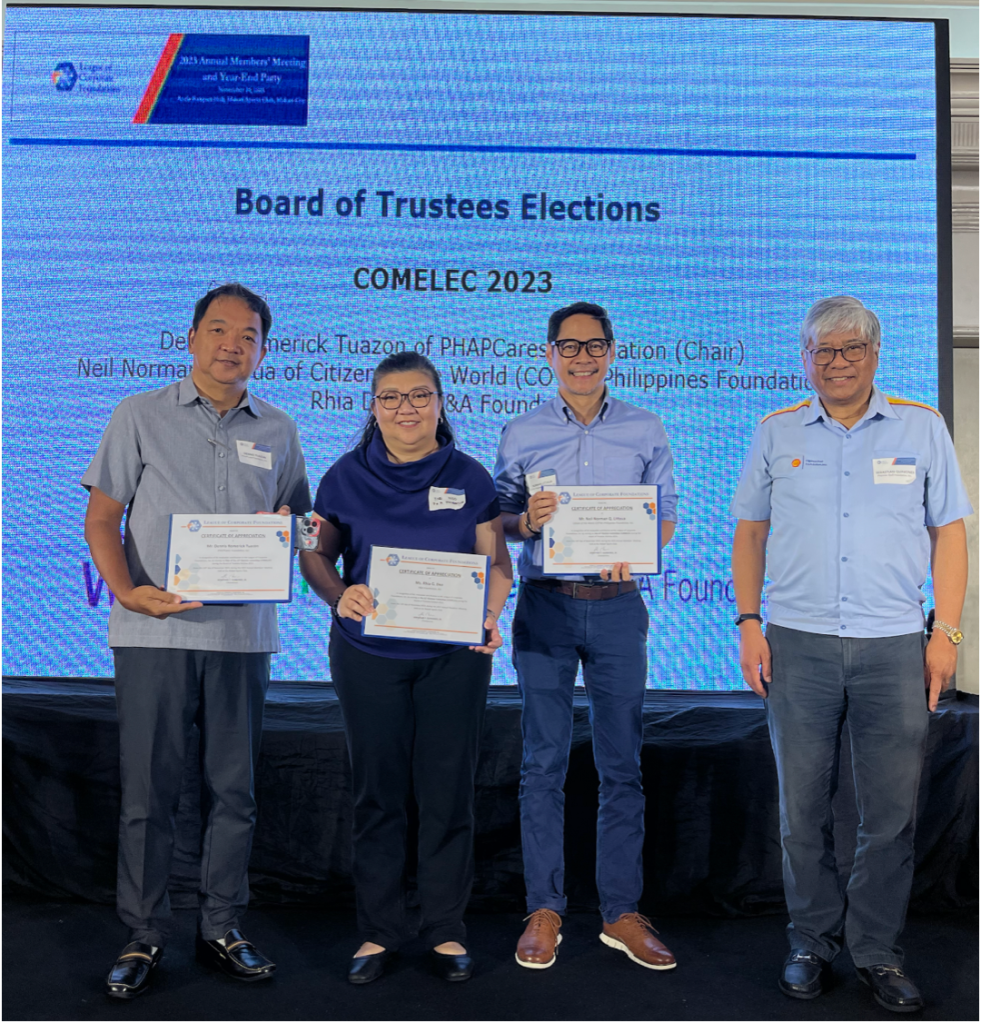 The members of the LCF COMELEC were also honored for having ensured a seamless and efficient BOT election. They were COMELEC Chair, Dennis Tuazon of PHAPCares Foundation, Inc.; Neil Norman Q. Littaua of Citizen of the World (COTW) Philippines Foundation, Inc.; and Rhia G. Dee of P&A Foundation, Inc., who was represented at the AMM by Kristine Ngo also of P&A Foundation.