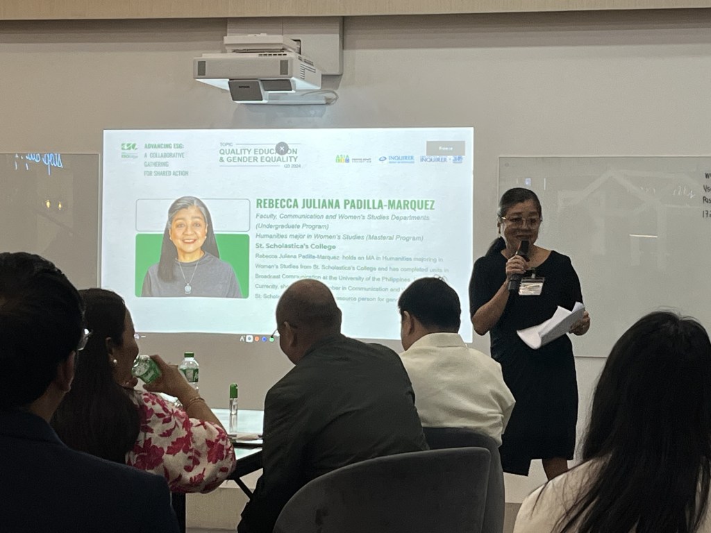 - Gender Equality: Ma. Aurora Geotina-Garcia, Management Association of the Philippines (MAP), Chair of the Philippine Women’s Economic Network (PhilWEN); Rebecca Juliana Padilla-Marquez, Faculty Member, St. Scholastica’s College