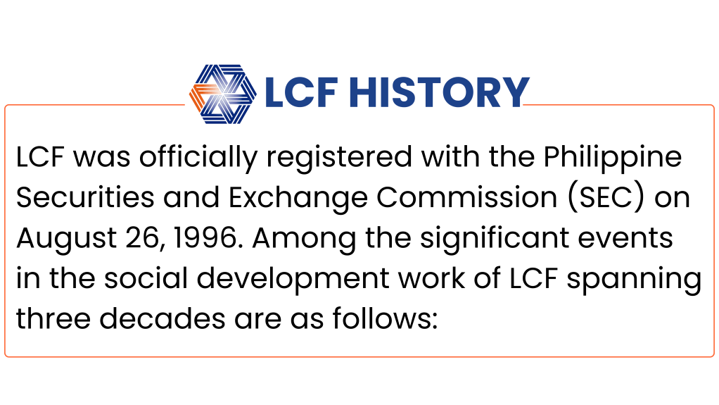 LCF was one of the six (6) of the largest networks of NGOs in the Philippines that organized the Philippine Council for NGO Certification (PCNC). The PCNC is a private, voluntary, non-stock, non-profit corporation whose main function is to certify non-profit organizations that meet established minimum criteria for financial management and accountability in the service to underprivileged Filipinos.