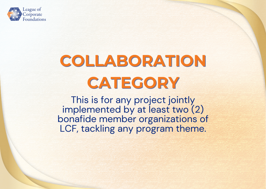 Collaboration Category: This is for any project jointly implemented by at least two (2) bonafide member organizations of LCF, tackling any program theme.