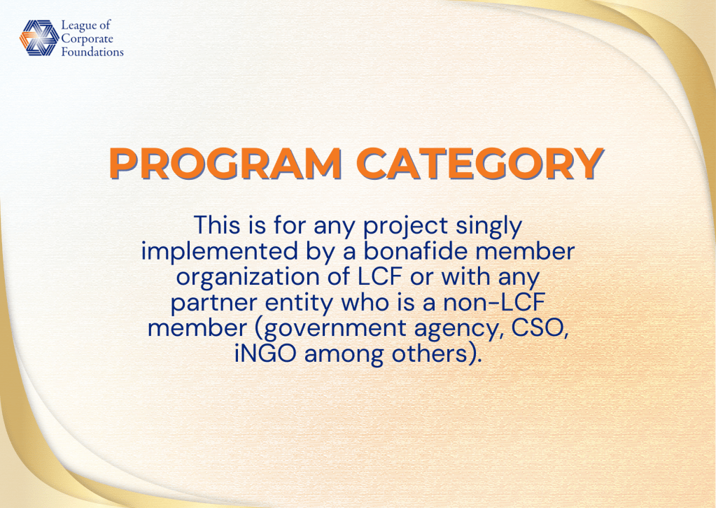 Program Category: This is for any project singly implemented by a bonafide member organization of LCF or with any partner entity who is a non-LCF member (government agency, CSO, iNGO among others).