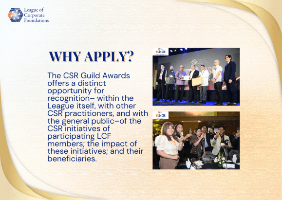 The CSR Guild Awards is a recognition program of the League of Corporate Foundations. It is a seal of excellence in corporate citizenship to the most reputable and premier organizations implementing social good initiatives with meaningful and sustainable impact to the communities and institutions they serve.
